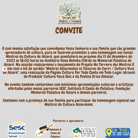 Olá, meu nome é Francisco Vagner Pereira, popularmente conhecido em Assaré e na região como Vavá Gois, tenho 43 anos, casado, com a Professora Bruna de Oliveira Pinto e pai de Valeska Leão Duarte Gois e de Davi de Oliveira Gois sou uma assareense nato nascido e criado em Assaré sou conterrâneo do maior poeta popular do mundo o eterno e imortal Mestre Patativa do Assaré, sou um dos fundadores e incentivadores do Instituto O Canto do Patativa em Assaré e atualmente no ano de 2025 ocupo o cargo de Vice-presidente também no decorrer dos anos na instituição já ocupei o cargo de presidente da mesma. Além de minhas atividades no Instituto O Canto d Patativa também sou fundador e presidente da A.D.A – Associação dos Desportistas Assareenses fundada em 2007 que nos dias atuais teve mudança em seu estatuto e não tem mais a sua finalidade só no esporte mais sim também nas áreas do social, cultura, esporte, meio ambiente, formações, assessorias e muitas outras finalidades e ficou com a seguinte nomenclatura na atualidade de Instituto A.D.A – Amigos de Ação Desenvolvimento e Cidadania. E como amante da cultura regional e de suas diversas expressões e manifestações criei a página e a assessoria de gestão nas áreas de Cultura, Turismo, Esporte, Juventude, Meio Ambiente e Gestão Pública.Desde criança e adolescente sempre gostei de movimentos e ações que contribuíssem com causas que contribuíssem com a melhoria da coletividade, tanto é que como grande fã e fascinado com as obras e com a defesa pelos direitos que o grande Mestre Patativa do Assaré sempre defendeu em suas poesias, canções, cordéis, livros, palestras, etc. Não poderia seguir outros caminhos se não ter o legado do mestre em meus pensamentos e trabalhos.