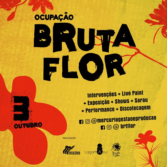 Bruta Flor – Arte e Invenção, nasceu com a ideia de buscar olhar o mundo das artes a partir de suas diversidades e possibilidades. Resultado do encontro entre as produtoras Casa das Poc Produções Criativas, LagartAzul Produção e Mercúrio - Gestão, Produção e Ações Colaborativas, nasceu a partir de diversas possibilidades das Artes, Culturas e Áreas Técnicas. O espaço conta com produção de shows, ações de formação, exposições, encontros. Imagens, sons, percepções, subjetividades. Perspectivas híbridas sobre os processos criativos.