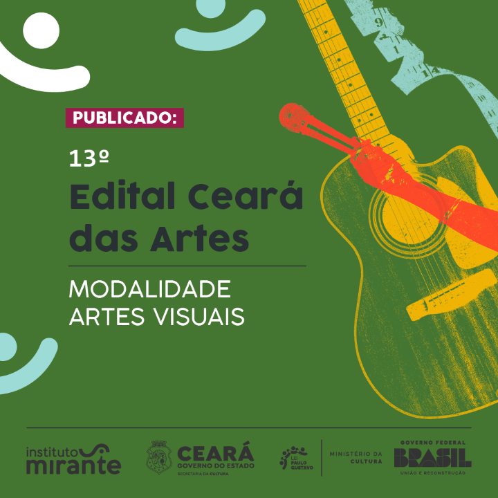 O 13º EDITAL CEARÁ DAS ARTES é uma ação continuada da Secretaria da Cultura do Ceará. Anteriormente denominado Edital de Incentivo às Artes, tem como objetivo incrementar a criação e a produção cultural, por meio de iniciativas individuais ou coletivas de artistas, curadores, pesquisadores, produtores, educadores e demais profissionais que realizam atividades no campo das artes. Fomentando processos de criação, produção, difusão, formação, pesquisa, intercâmbio e fruição das expressões artísticas; Incentivando a sustentabilidade de artistas, grupos, coletivos, companhias e demais profissionais e empreendimentos culturais; Valorizando a produção artística do Estado, contribuindo para a geração de renda de artistas, técnicos e fazedores de cultura em geral, grupos, coletivos e companhias culturais, contribuindo para a inclusão social, o fortalecimento da cidadania e a efetivação dos direitos culturais no estado do Ceará